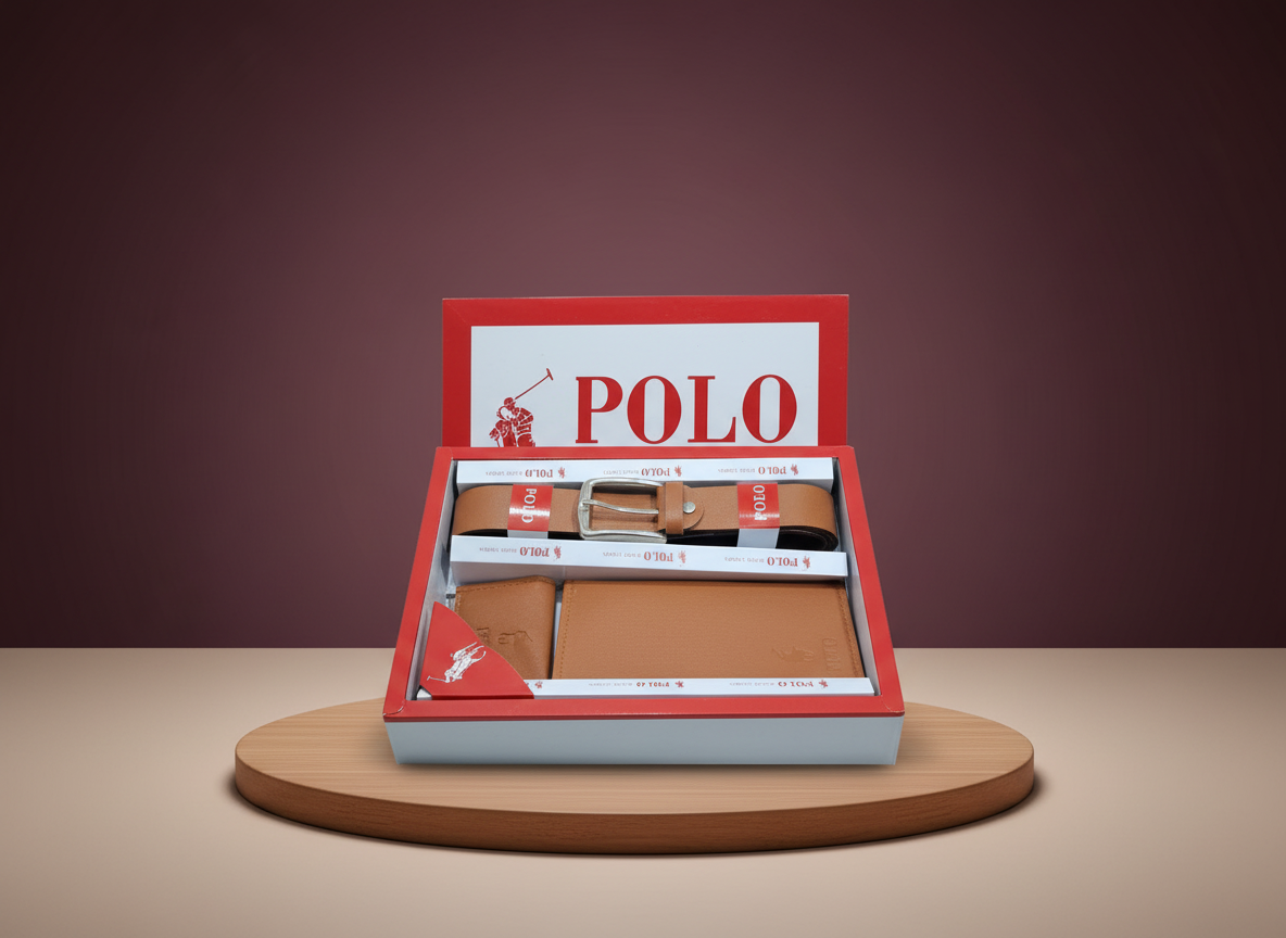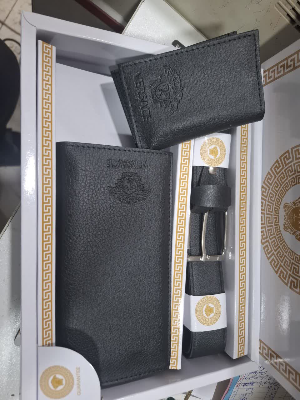 یه کیف پول پالتویی و جاکارتی از جنس فوم و یه کمربند مردانه داخل یه بسته بندی با طرح ورساچه و پولو